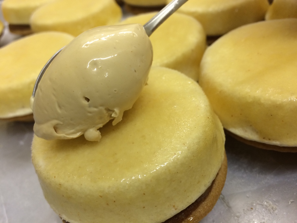 紅茶のアングレーズクリームはセルクルに流し込んでおいて、冷え固まったらミルクティーのグレーズを厚掛けします。