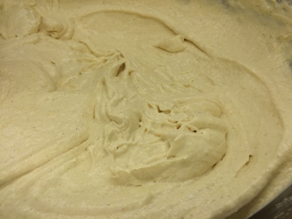温めた生クリームと粉糖をマスカルポーネに注ぎ入れてホイップクリーム状に泡立てます