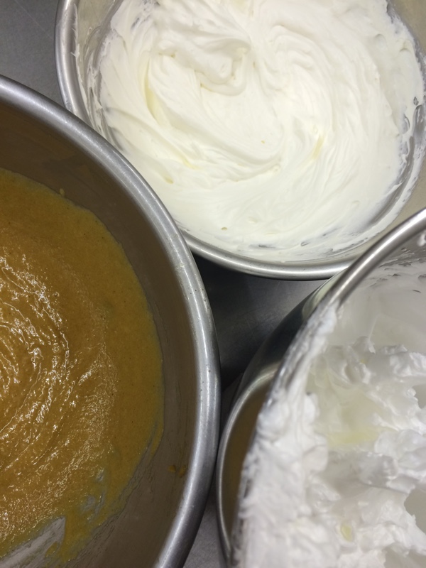ピューレは温めてゼラチンを溶かしこんで、ホイップクリーム、イタリアンメレンゲと混ぜ合わせます