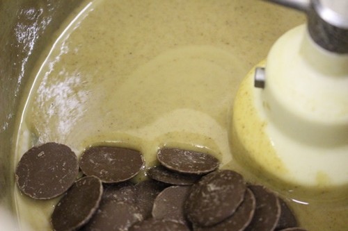 薄皮に苦味が出やすいため、低温で蒸気の力を借りて、酸化しやすいくるみを香ばしく調理したら、カッターミキサーでペースト状に撹拌します。くるみがペースト状になったら、ベネズエラ産ミルクチョコレートを加えてコンチングして、くるみフレーバーのジャンドゥーヤを完成させます。