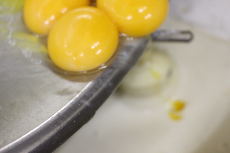 卵黄、生クリーム、グラニュー糖を加えて再び温めてプリン生地を完成させます。